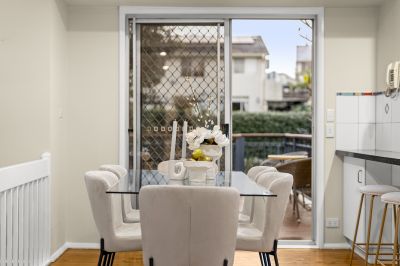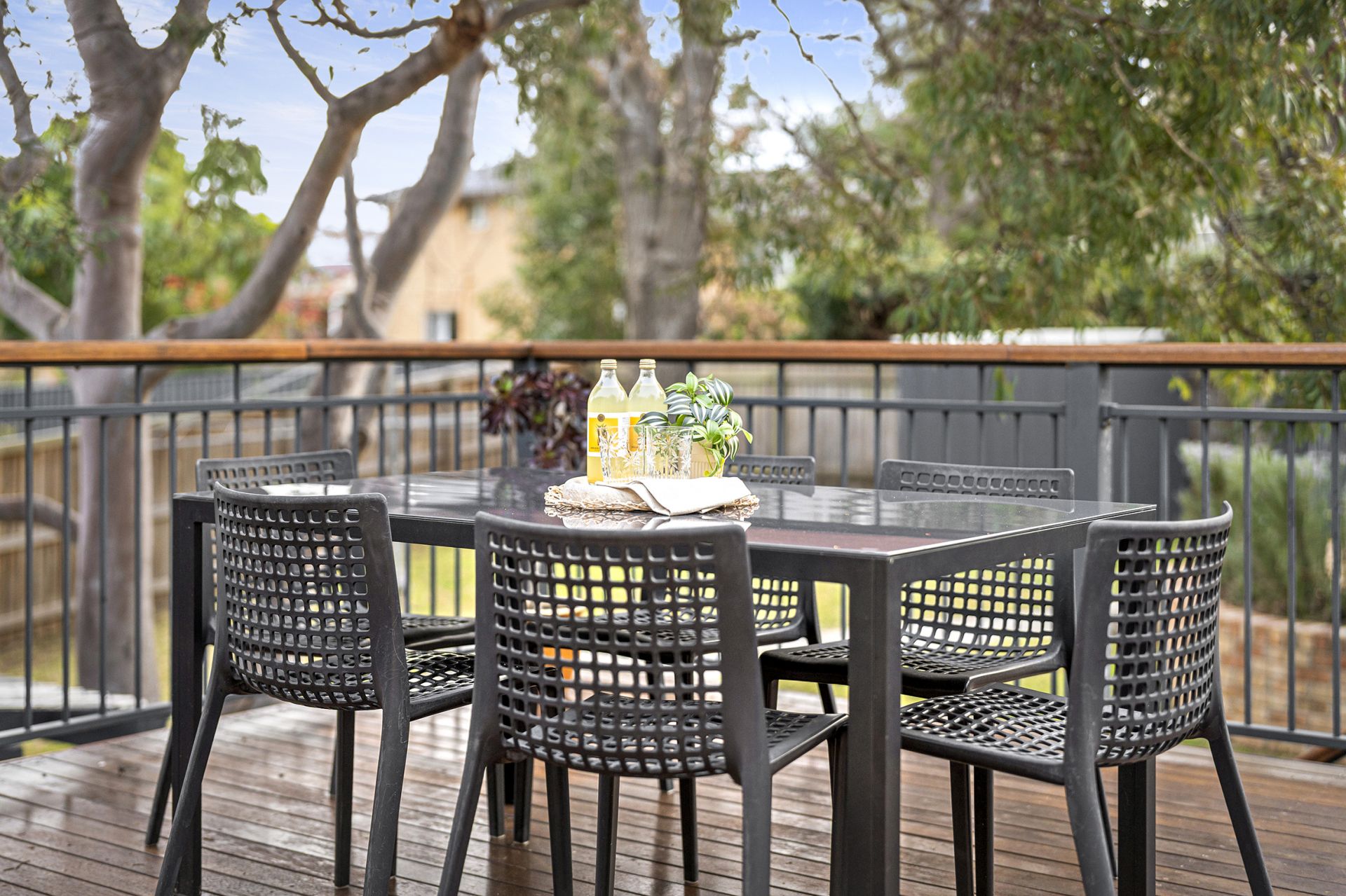 - Sun-drenched upper living, kitchen, and dining area featuring seamless transition from front balcony to rear outdoor decking